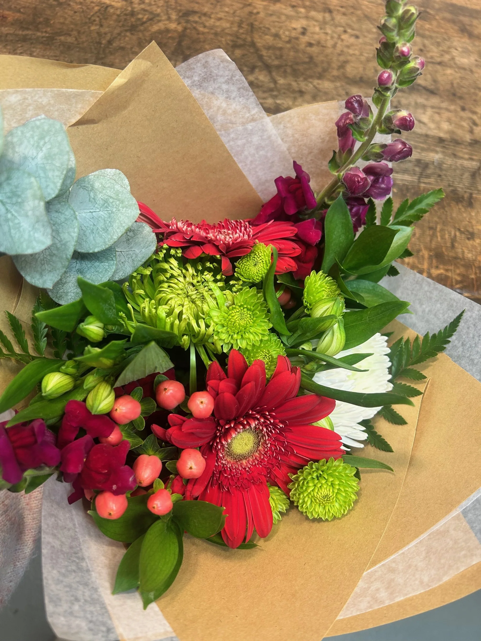 The photo is an example of a made-to-order arrangement, and while it may not reflect the final product, each arrangement is unique and designed using the freshest flowers available. If you have any colour preferences, please let us know in the notes and we will do our best to accommodate!