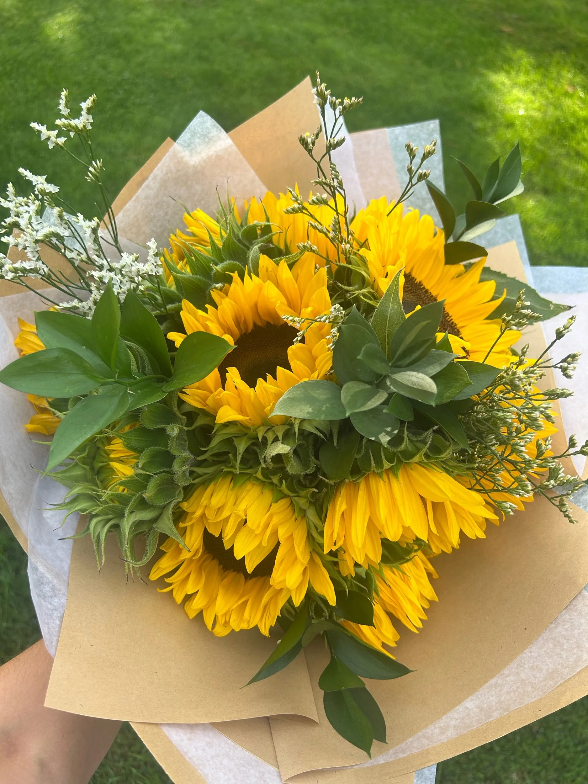 Beautiful, local sunflowers accented with greenery and filler flower.